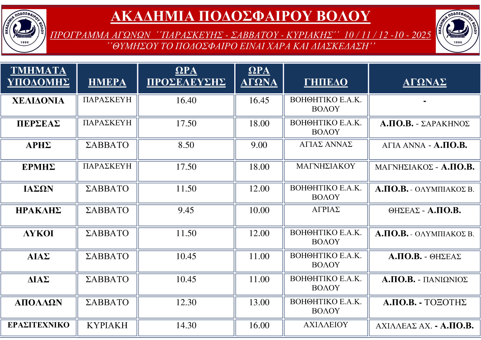 Για εγγραφές και πληροφορίες οι γονείς μπορούν να επισκέπτονται καθημερινά, εκτός Σαββάτου και Κυριακής, από τις 16:00μ.μ. έως τις 20:00μ.μ. τις αθλητικές εγκαταστάσεις της Α.ΠΟ.Β. που βρίσκονται Σταδίου 22 ( Ε.Α.Κ. Βόλου - Θυρα 6, προς Δάσος Γορίτσας ). Επίσης το πρόγραμμα της αθλητικής περιόδου 2025-2026 έχει αναρτηθεί στην ιστοσελίδα της Ακαδημίας apov1996.webnode.gr ενω οι γονείς μπορούν να επικοινωνούν καθημερινά με την γραμματεία της σχολής στο 24210-53336 ή με τους προπονητές ( 6973248533, 6977014249, 6977229114, 6980185899 ). Τέλος η λειτουργία όλων των τμημάτων υποδομής της Ακαδημίας Ποδοσφαίρου Βόλου θα ξεκινήσει από την Δευτέρα 1 Σεπτεμβρίου 2025.